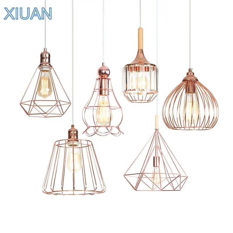 LED Rose Gold Lamp American Simple Wooden Hanging Pendant Light for Kitchen Bedroom Living Room Iron Cage Suspension Luminaire