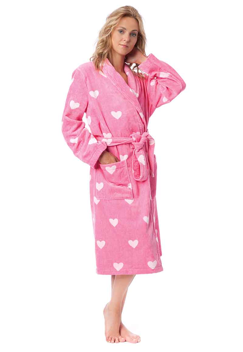 Voel je nog geliefder in deze liefdevolle roze damesbadjas met hartjes.