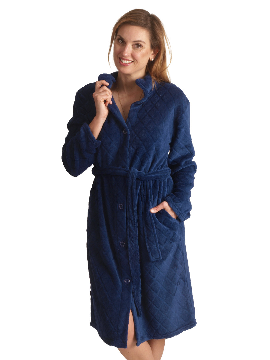 Moderne blauwe damesbadjas met knoopsluiting. Gemaakt van 250 grams fleece.