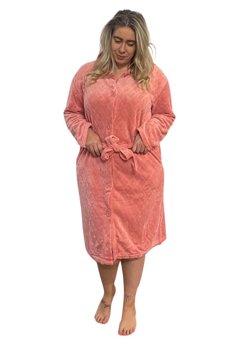 Deze oudroze damesbadjas met knopen is voorzien van knoopsluiting & bindceintuur.