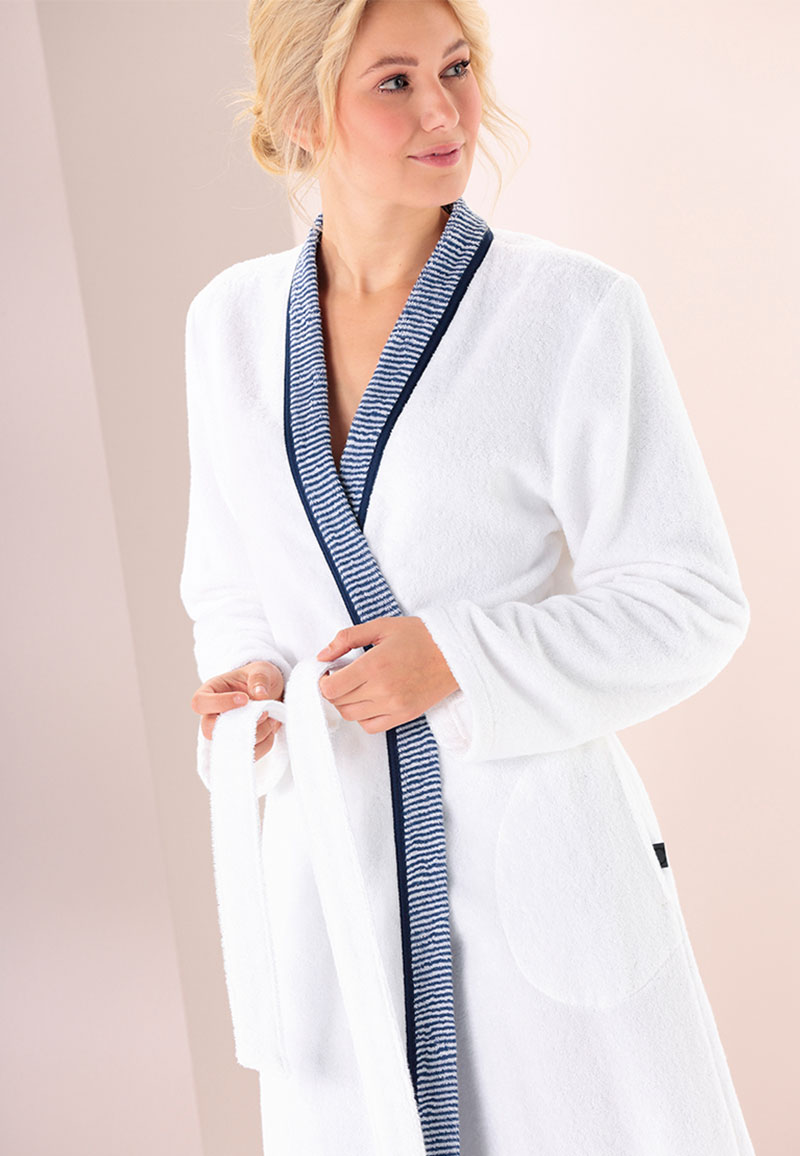 Deze witte Cawo dames kimono is vervaardigd uit 100% premium badstof-katoen. Voorzien van luxe marineblauwe bies met streepjes.