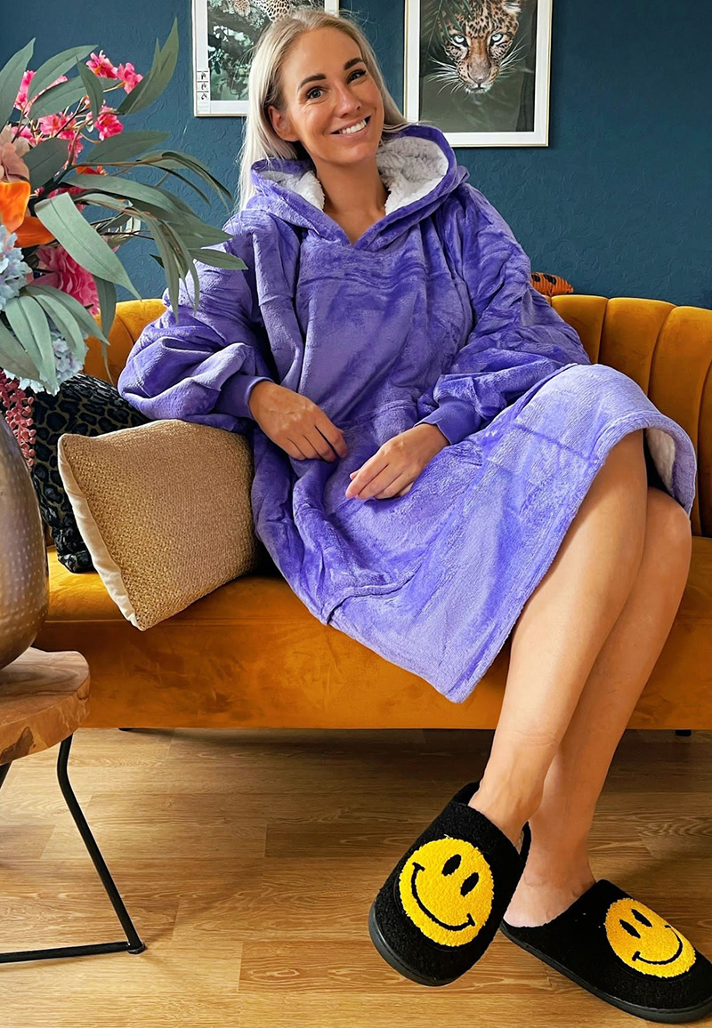 Kruip helemaal weg in deze draagbare deken met capuchon en mouwen. Voorzien van luxe sherpa-voering & gigantisch voorvak.