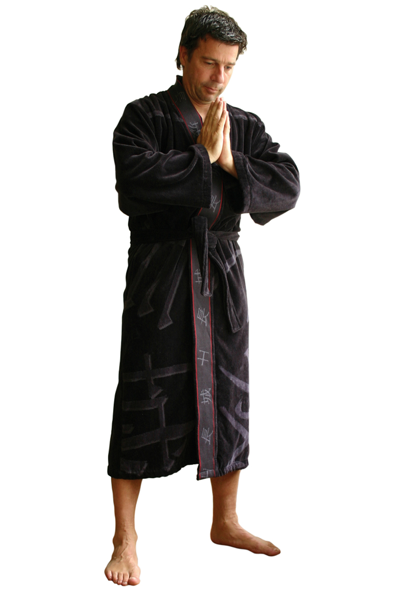 Deze fluweelzachte heren badjas heeft een jaquard grote Japense schrifttekens ingeweven. Een funky badjas in japanse stijl.