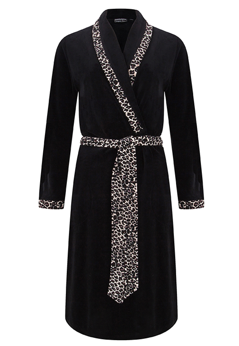 Een luxe kamerjas van hoogwaardige velours katoenen kwaliteit. (80% katoen, 20% polyester). Deze zwarte badjas is afgewerkt met een panterprint ceintuur, sjaalkraag en manchette.