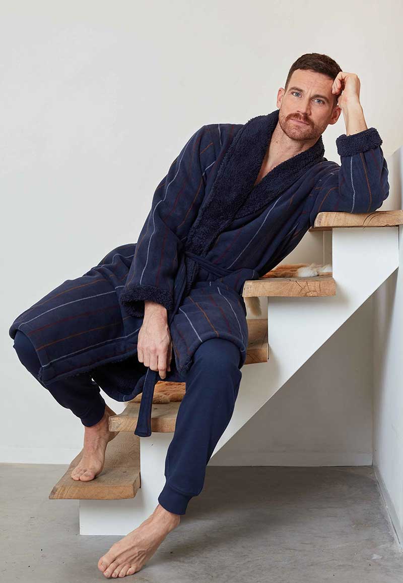 Deze comfortabele marine heren badjas is voorzien van streepmotief. Luxe gevoerd en afgewerkt met zachte teddystof.